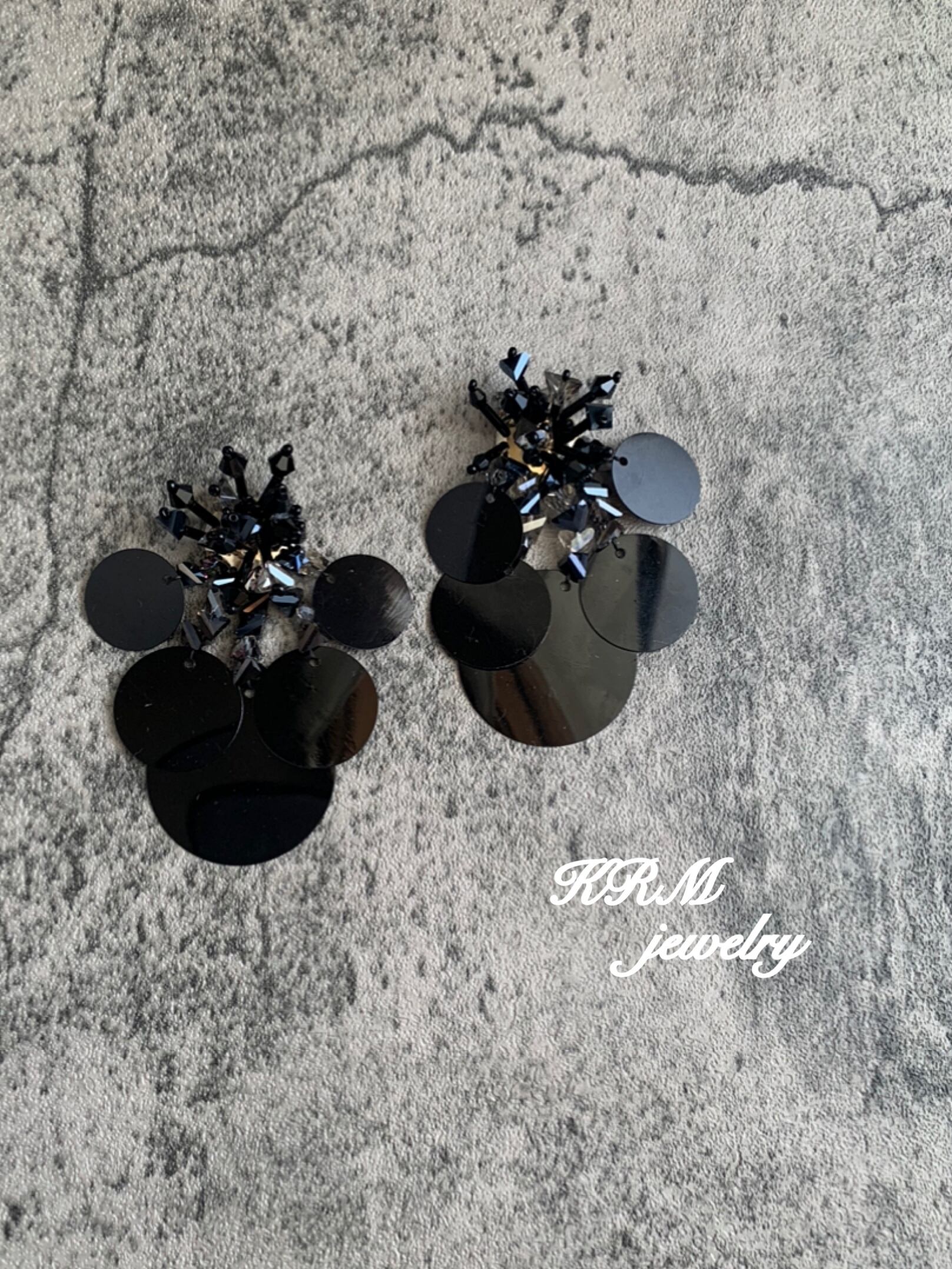 ◯ビーズを沢山使ったビジューピアス。トライアングルの透明感のあるビーズの先にスパンコールが揺れる個性的な形のピアスです。