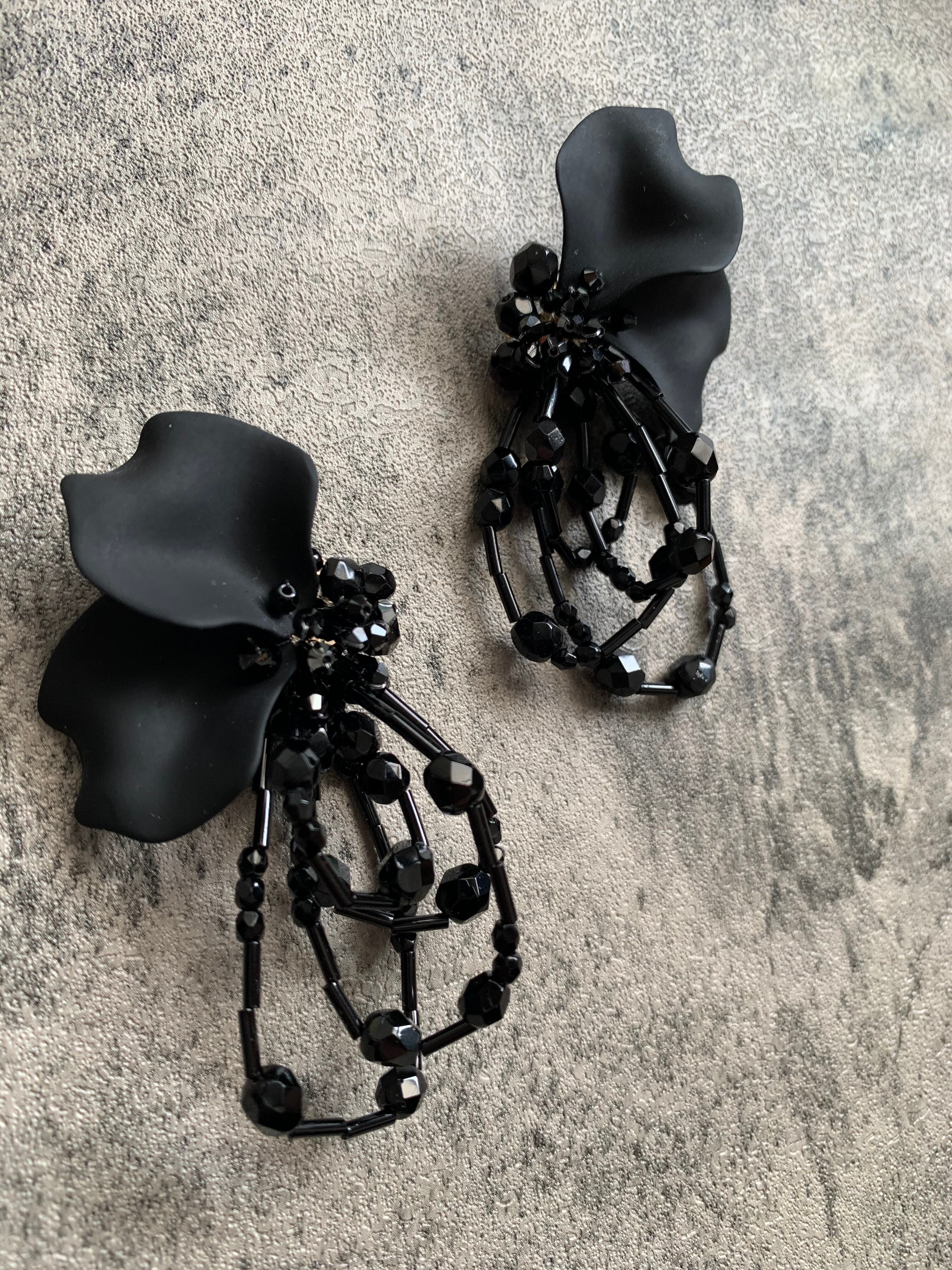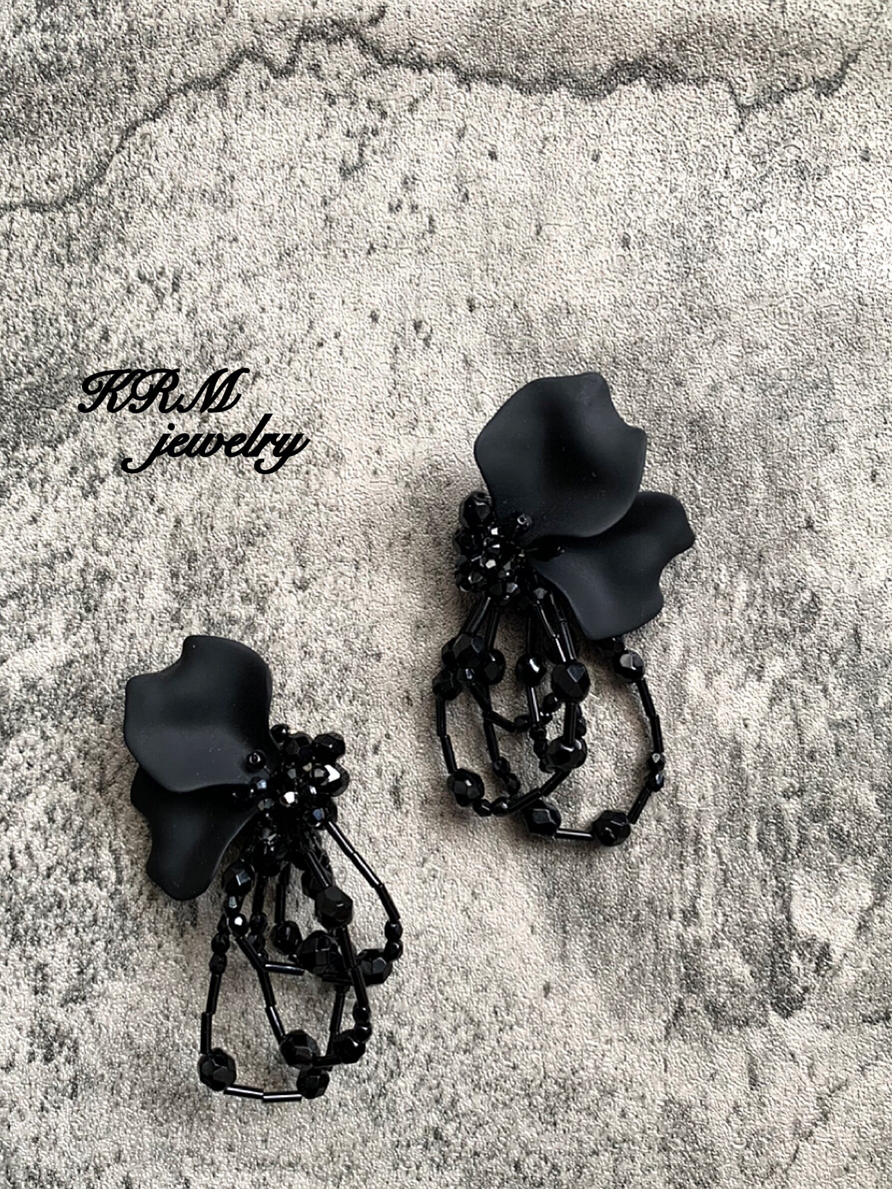 ◯ビーズのチェーンが揺れる大ぶりのお花のビジューピアス。インパクトのあるピアスを是非♪