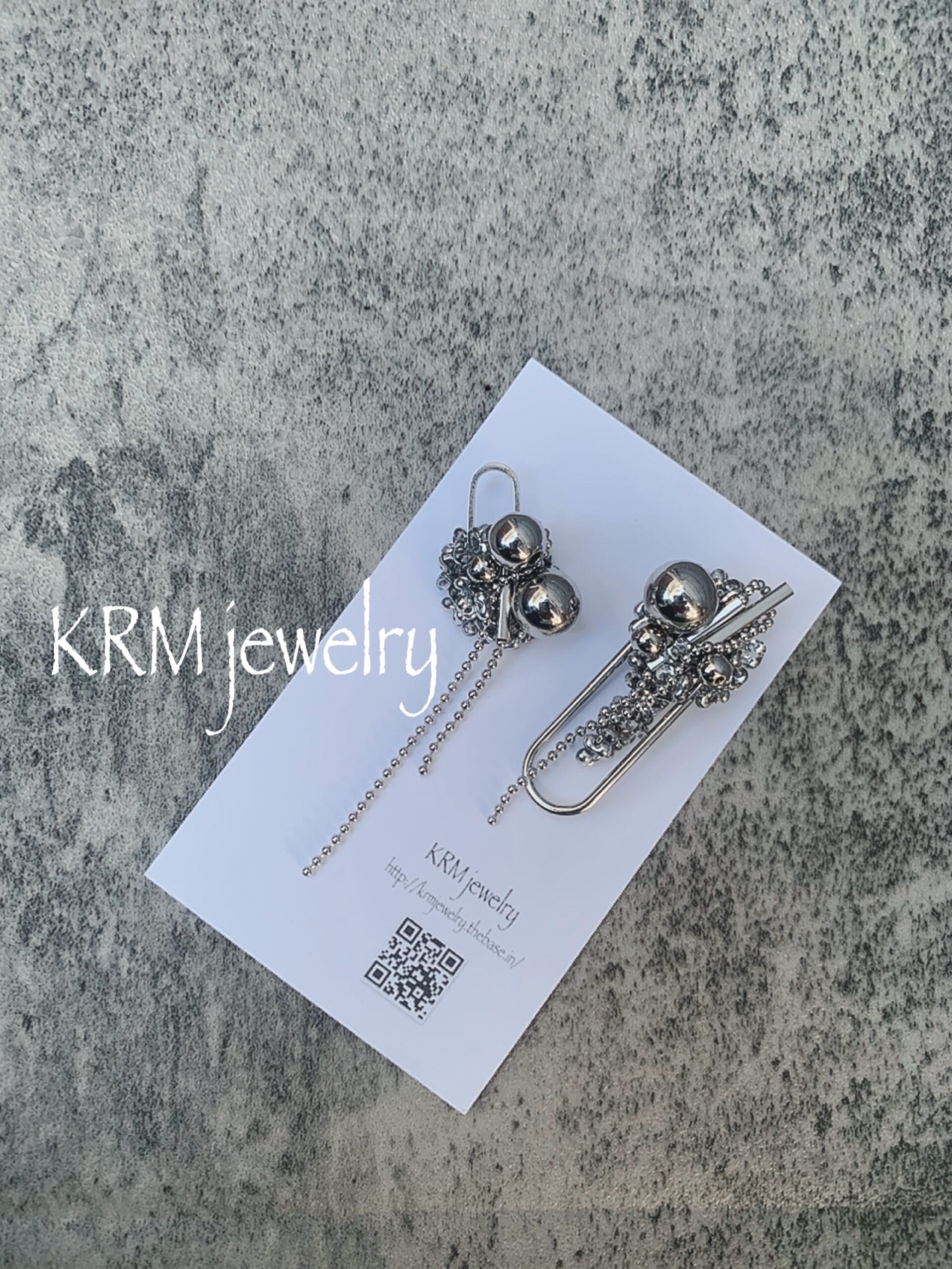 ◯シルバーを基調としたアシンメトリーなビジューピアス。揺れるボールチェーンや、小さなビーズなどがいっぱい詰まったモードアクセサリーになります。